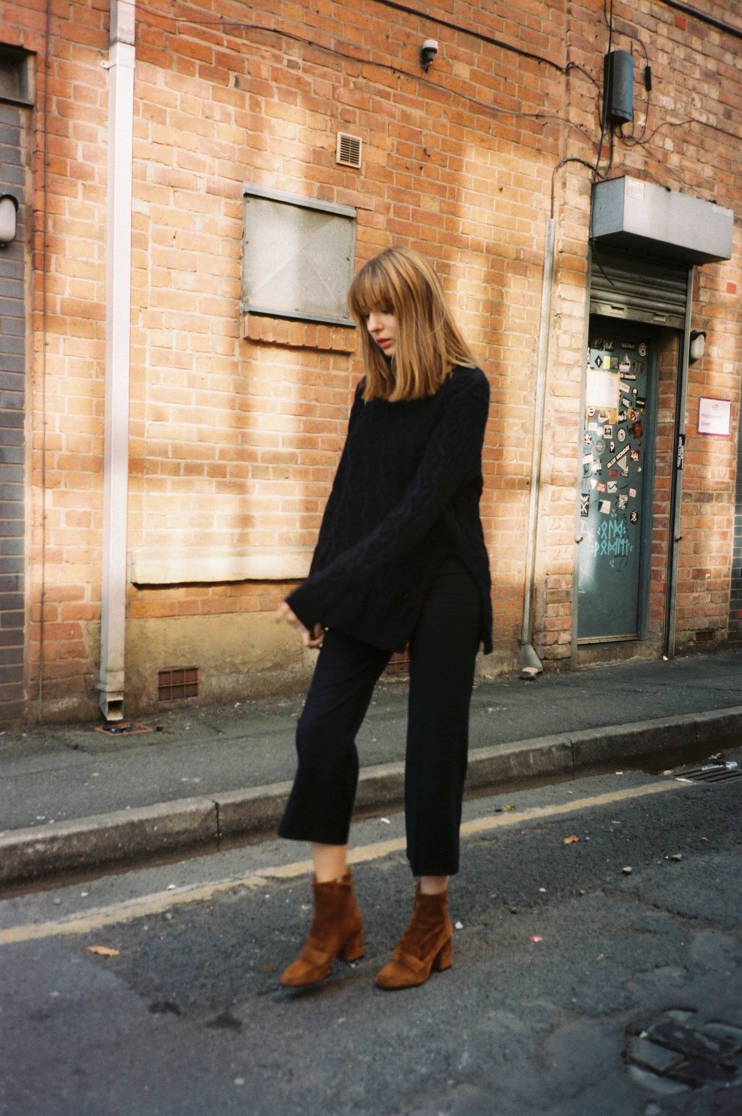 Черные замшевые сапоги, светлая юбка и свитер, черное пальто