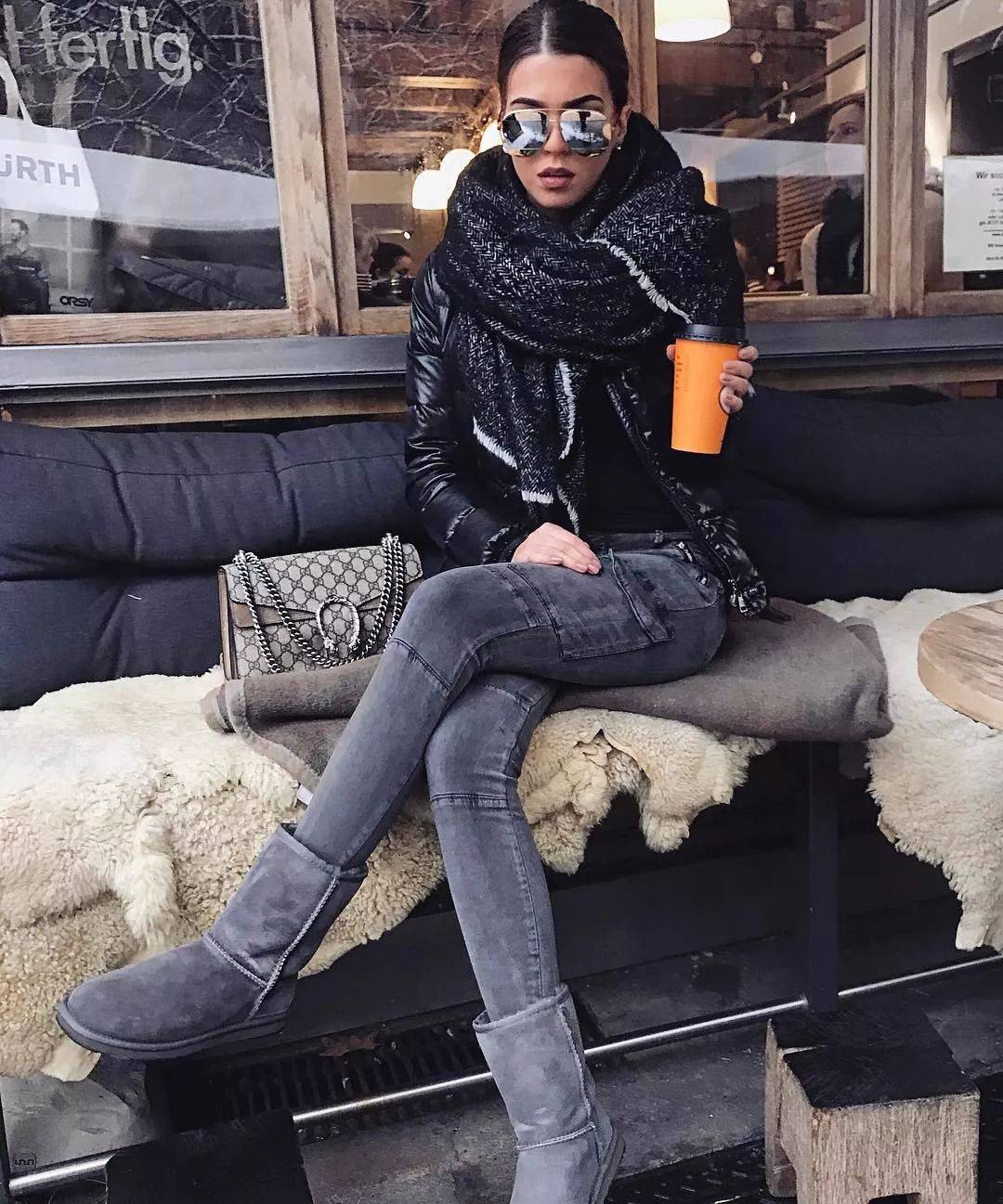 - Серые ботфорты прекрасно сочетаются с черным пальто и зауженными черными брюками. Обувь можно подобрать на плоской подошве или на высоком каблуке.