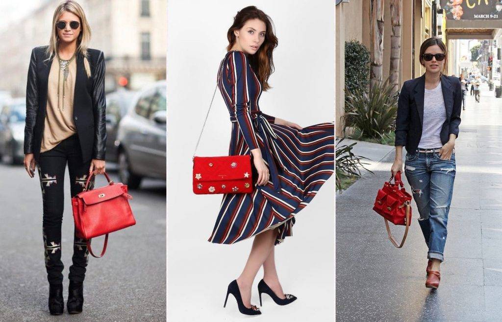 Законодательницы моды уверены, что красная сумочка – это не дополнительный аксессуар для завершения определенного облика, а, наоборот, его основа. А значит, необходимо грамотно выбирать отдельные элементы одежды для составления разнообразных образов с красной сумкой. Следует знать, что акцентируя взгляд на ярком аксессуаре, нужно подбирать к нему всего лишь один предмет с похожим оттенком.