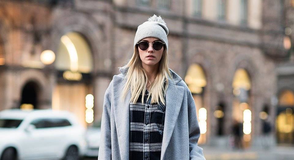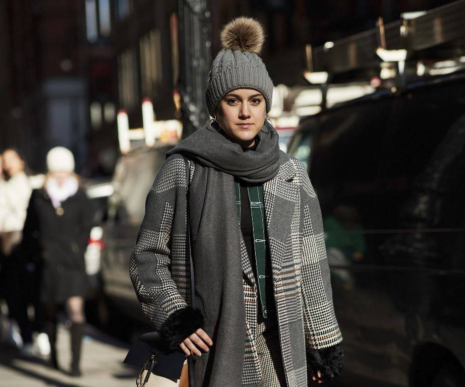 Светлая вязаная шапочка плюс серое пальто и клетчатая рубашка равно дерзость и молодость.