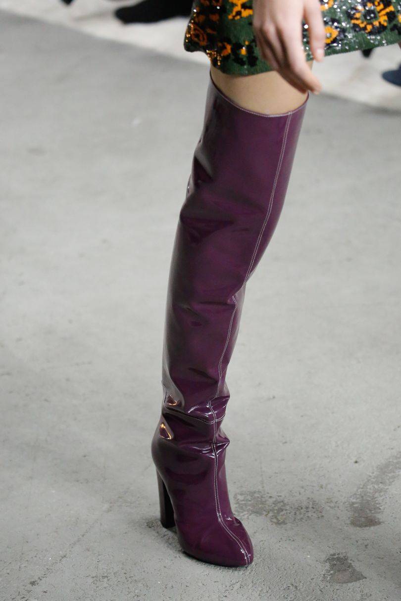 Зимние сапоги на плоской подошве в сливовом оттенке, дизайнер Vivetta Ponti рекомендует носить с длинной шубой тигрового окраса и тонким декоративным шнуром с кисточками, вместо пояса. Американский модельер Joseph Altuzarra, для которого вдохновением стала эпоха Возрождения, представил публике утонченные пальто с корсетами, шнуровками и узорами из тесьмы, дополнили образы сапоги черные на плоской подошве со шнуровкой и многочисленными люверсами. Итальянский бренд Miu Miu советует сочетать такую обувь с шубками с длинным ворсом ярких оттенков.