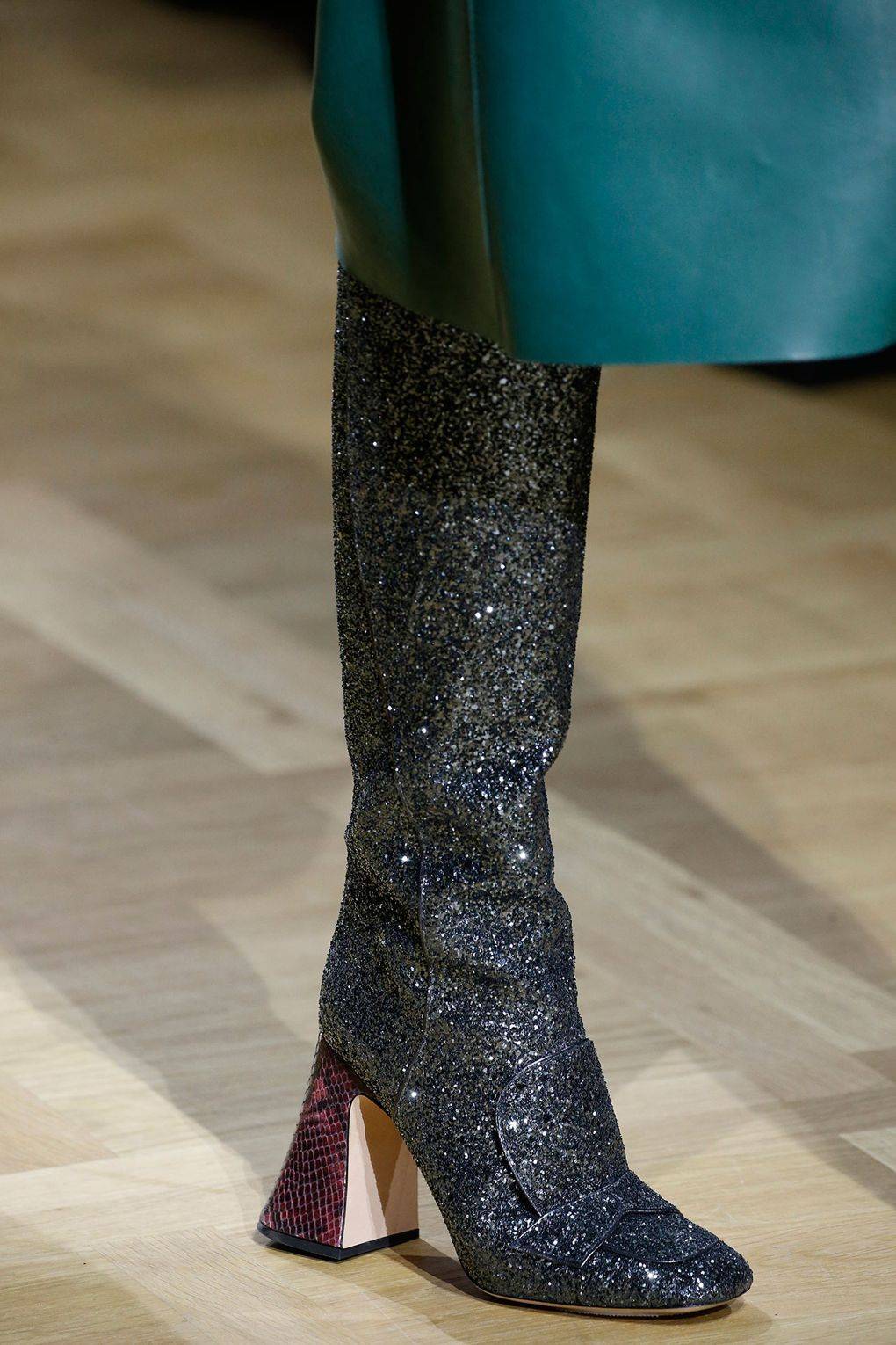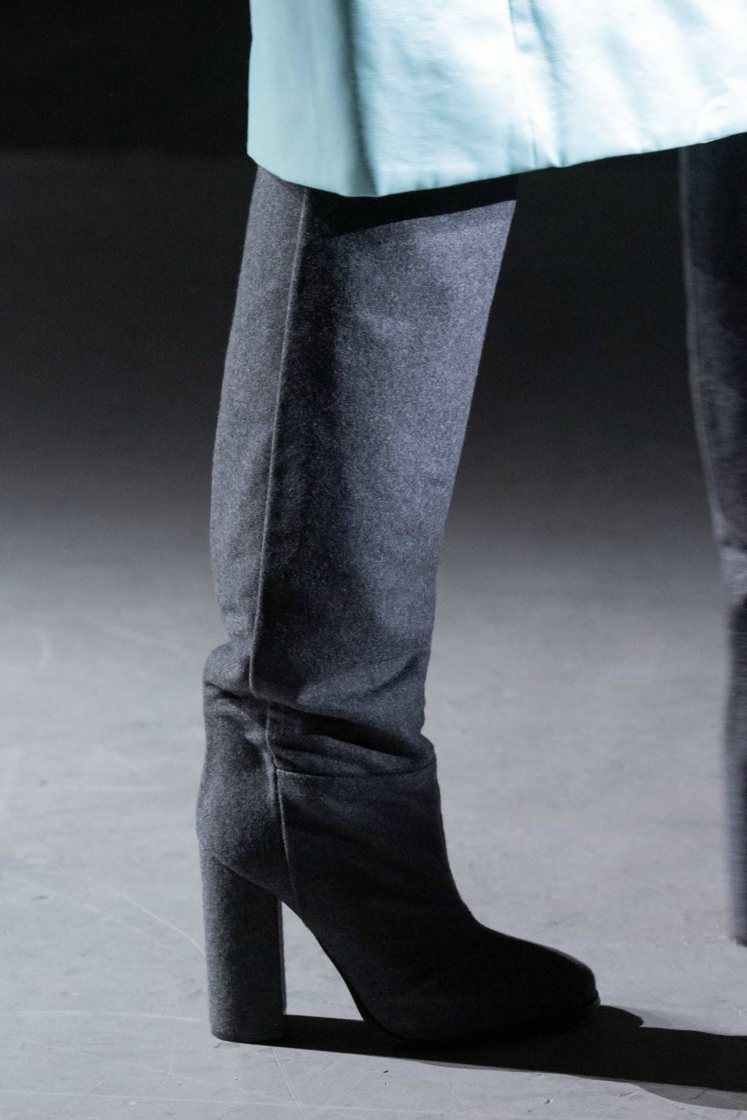 Бренд Byblos показал черную обувь с декоративными строчками и отворотом голенища в ансамбле с разнообразными пальто, украшенными яркими геометрическими фигурами, градиентами и меховыми воротниками. В молодежной линейке бренда Miu Miu дизайнер Миучча Прада соединил необычные пальто, украшенные ярким искусственным мехом с обувью: