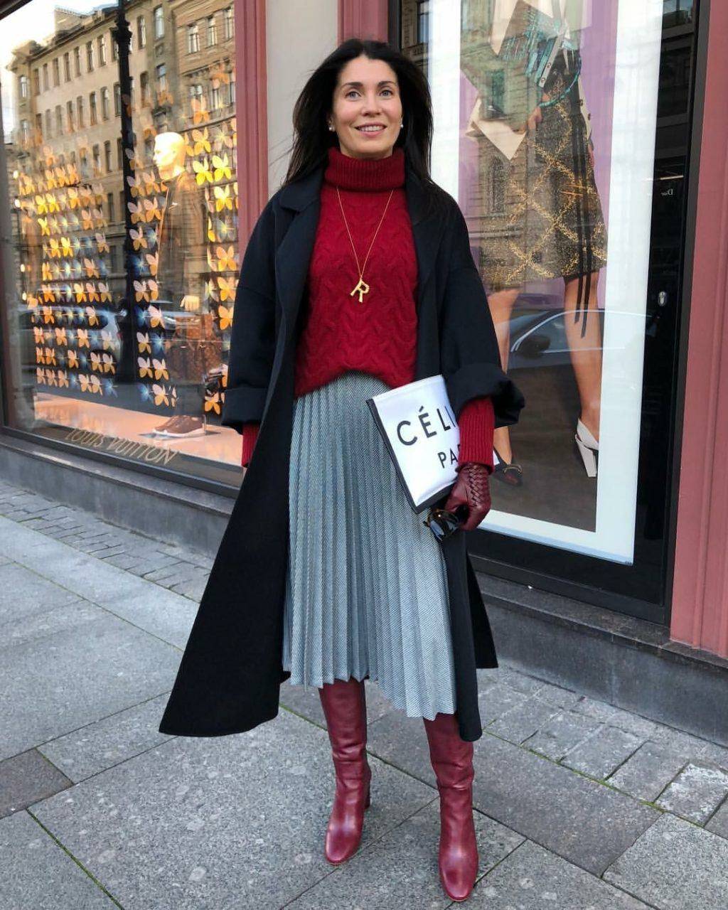 Также стоит обратить внимание на юбки плиссе миди или макси, юбки на запах из более плотной ткани или изделия из денима, которые прекрасно сочетаются с классическими туфлями, высокими сапогами и даже спортивной обувью