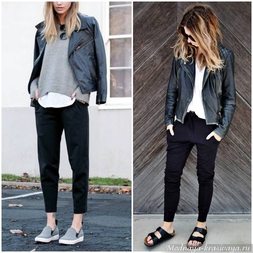 Если вы предпочитаете стиль smart casual, к брюкам с лампасами подберите свободный свитер или легкий джемпер. Другой вариант – облегающие модели с кожаной курткой и блузой.