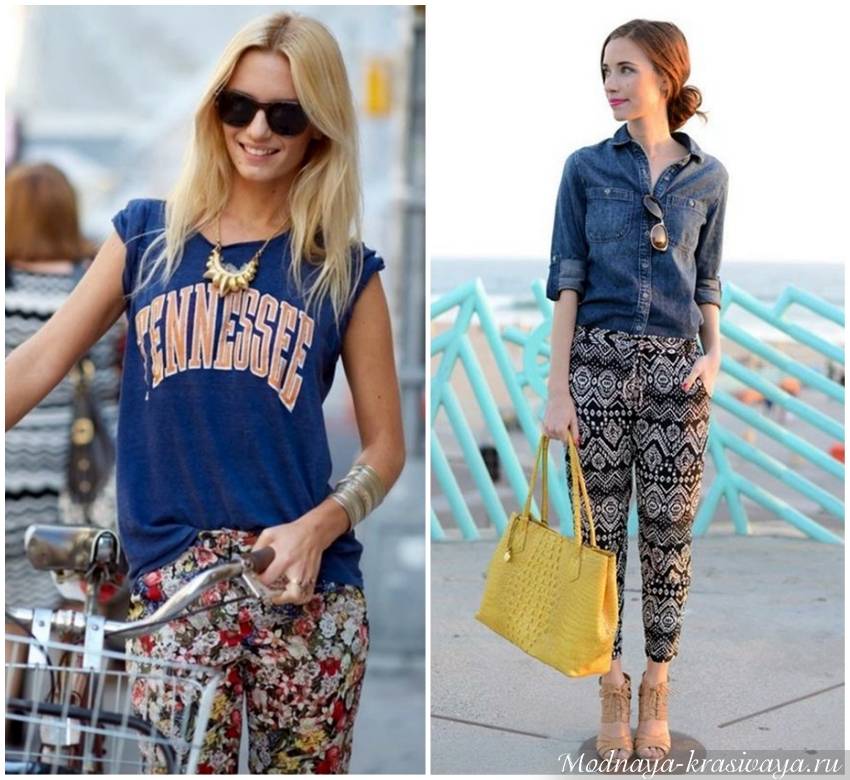 Другим, не менее актуальным вариантом считаются узкие и очень длинные, низ которых собирается в гармошку на щиколотке. Их можно использовать в повседневных, очень элегантных образах. Облегающий силуэт с плотной посадкой на бедрах, поясом на талии или чуть ниже сделают стройной любую фигуру. Изготавливаются из плотных тканей, могут декорироваться на поясе и карманах. Такой фасон отлично смотрится в нейтральных цветах и ярких. В качестве верха лучше выбирать яркие, необычные цвета и их сочетания.