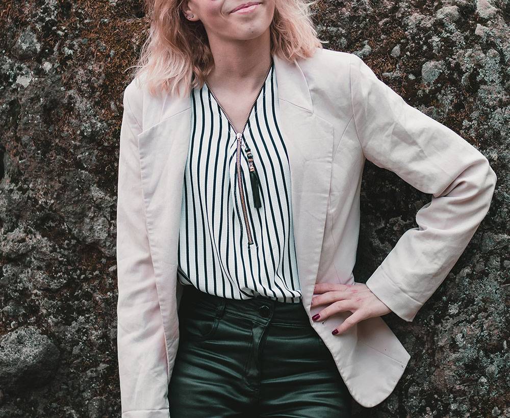 С джинсами и футболкой пиджак в полоску создаст неповторимый street style, а с чёрными прямыми брюками и белой блузой – деловой look. Многое зависит от обуви: каблуки добавляют женственности, платформа или кеды сразу делают образ неформальным.