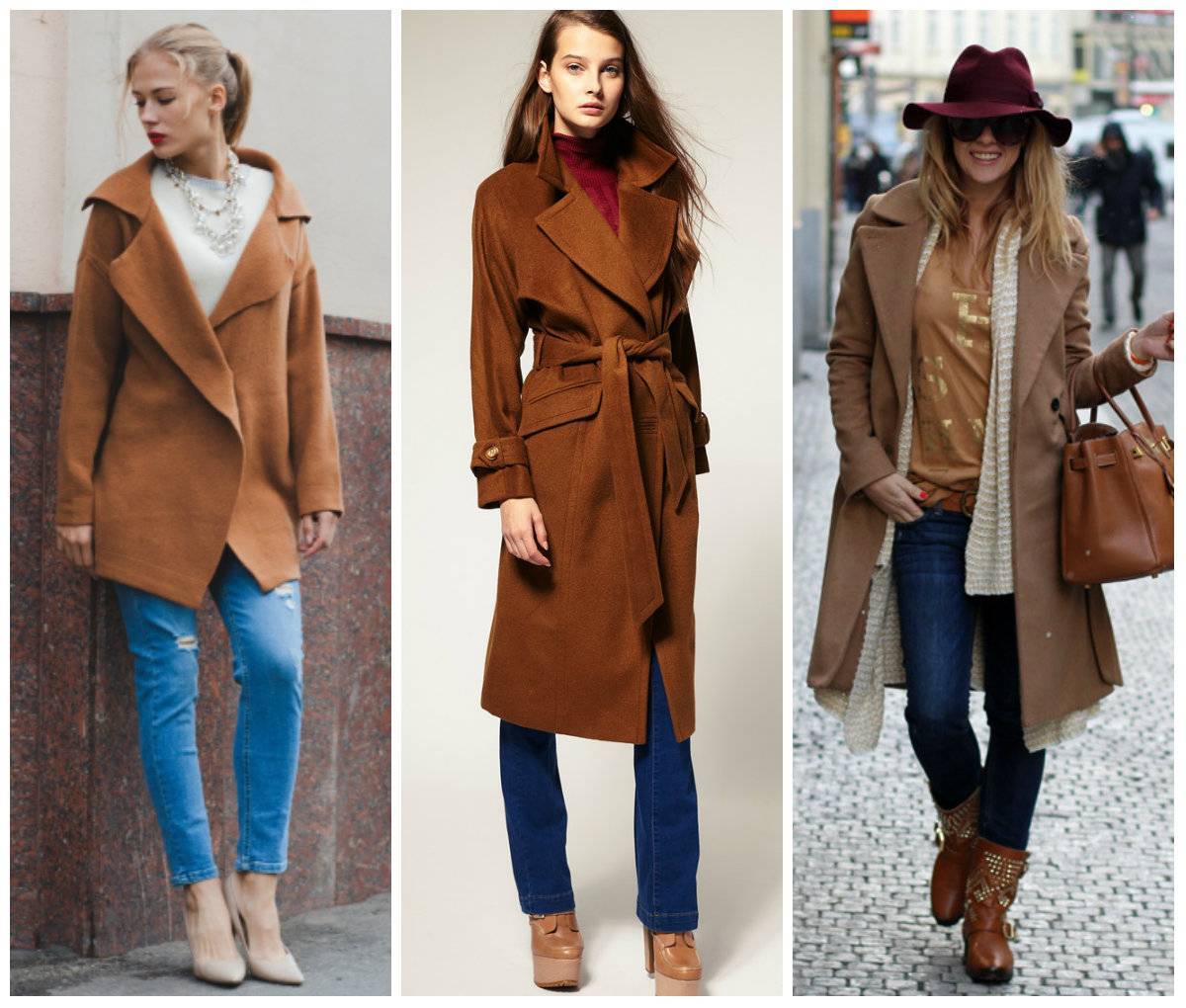 Насыщенные оттенки коричневого гармонируют с синим и бордовым. Ансамбль, построенный на контрасте, позволяет использовать одежду светлых тонов в схожей цветовой гамме. Основным условием выбора остаётся фасон пальто.