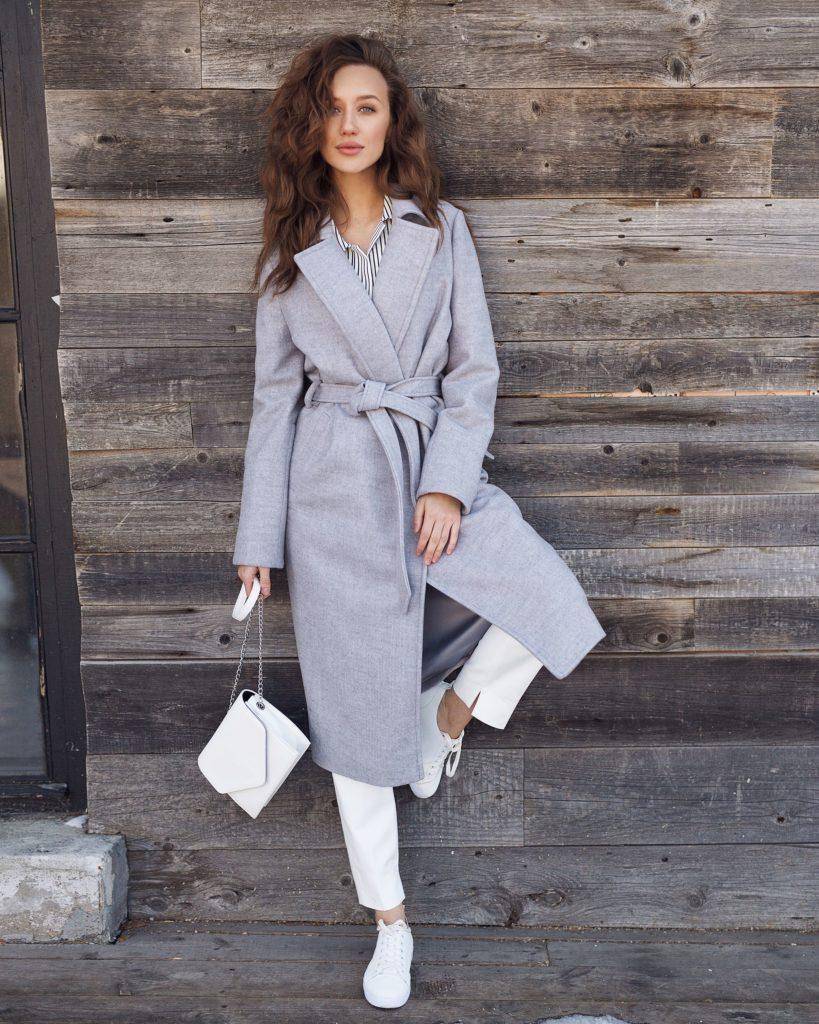 К светло серому пальто подойдут нюдовые тона одежды, нежные платья и блузы. Хорошо будут сочетаться со светло серым пальто голубые и розовые джинсы, черные и коричневые брюки, а также лиловые, малиновые, кремовые и баклажановые свитера и блузы.