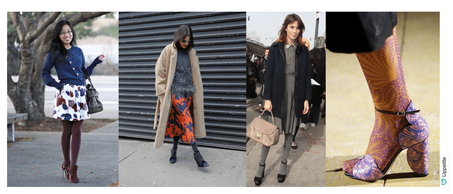Прозрачные колготки. С ними проще всего ошибиться и вместо стильного образа, получить безвкусный. В первую очередь, забудьте про телесные глянцевые капроновые колготки. Этот пункт точно не про них. Здесь речь идет о цветных или черных колготках, желательно с принтом или рисунком (мои любимые — в горошек), а также колготки «сеточкой». В большинстве случаев, работает правило, что чем меньше будет открыт пальчик в обуви, тем лучше. То есть такой тип колгот лучше подходит как раз не для босоножек, а именно для обуви с открытым носком. И да, следите чтобы не было видно носочного шва и у вас был идеальный педикюр!